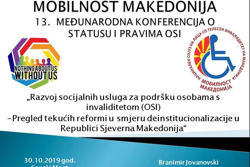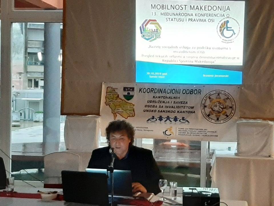 Во организација на кантоналните здруженија на лицата со инвалидност од Унско-Санскиот кантон во Бих, од 29 до 31 октомври во Сански Мост по 13. пат се одржа меѓународната конференција „Да делуваме заедно“. „Мобилност Македонија“ традиционално учествува и конструктивно придонесува во работата на конференцијата, и овој пат со импресивен настап на претседателот Бранимир Јовановски за успесите на деинституционализацијата и првичните резултати, во организација и полна изведба на МТСП. По рефератот, а и после во кулоарите, имаше дискусии и согледување. Општиот впечаток е дека во С. Македонија се направени смели чекори кон решавање на оваа проблематика. За жал, такви чекори во разговорите со претставници од БиХ, Хрватска и Словенија, не се направени во регионот, па и пошироко. Во повеќето излагања имаше доктори – педијатри, невролози, физијатри, дефектолози, логопеди, тифлолози, министри и директори на установи, се пресејуваше желбата за остварување на целите. Цели кои ние делумно ги исполнивме и сега теба да ги надградиме. Со други зборови, од овие конференции има што да се слушне и научи, начинот на делување и опкружувањето е секаде речиси исто. Неопходна е примена и надградба на регулатива, и тоа стриктно. Нашата екипа составена од Бране, Софче, Нико и Горан, остави добар впечаток кај присутните и ние сме радо видени гости таму. Делуваме понатаму.